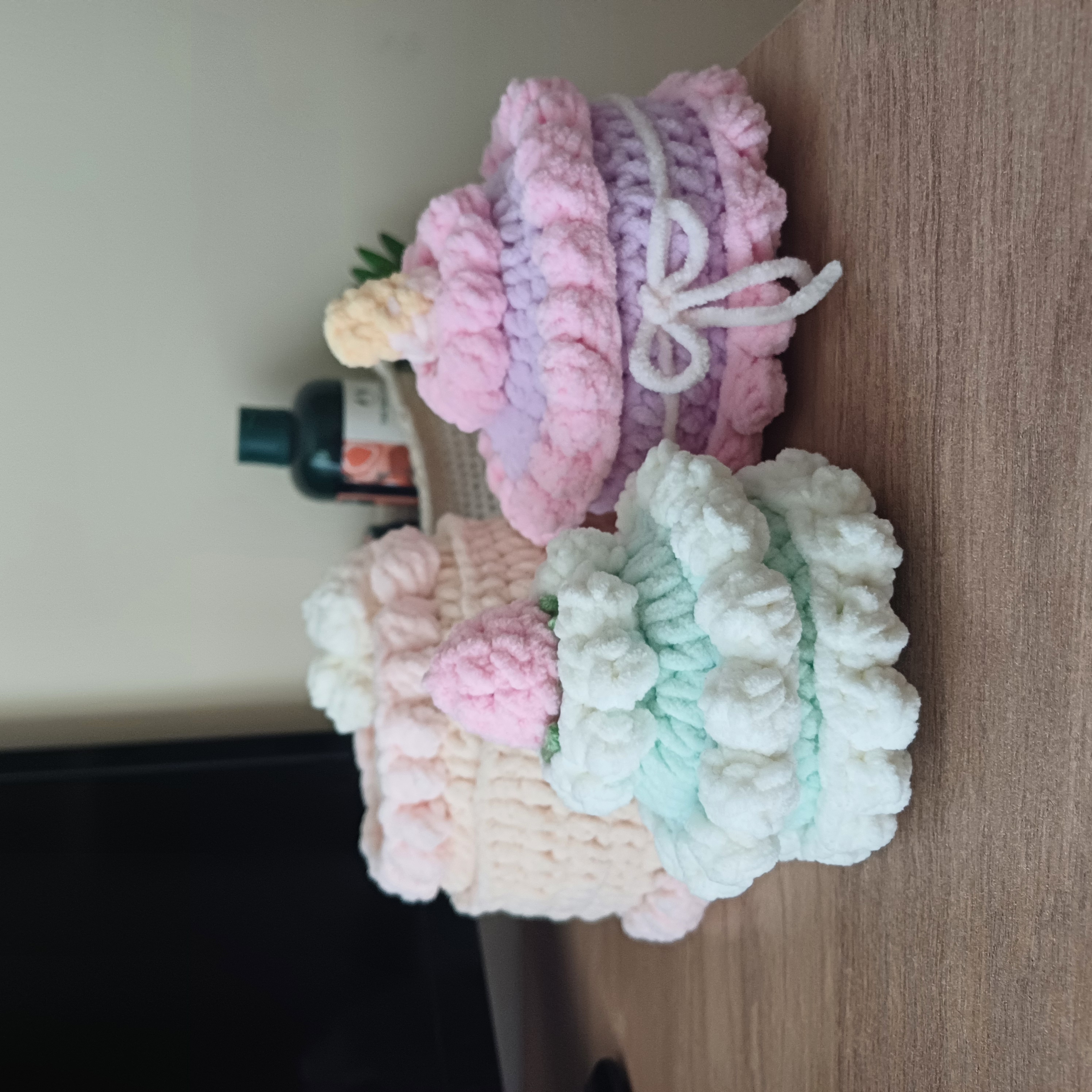a charming collection of crochet cakes, perfect for adding a sweet touch to your handmade decor. each cake is carefully crafted using soft yarn in vibrant colors, with intricate details like frosting, sprinkles, and tiny decorations.